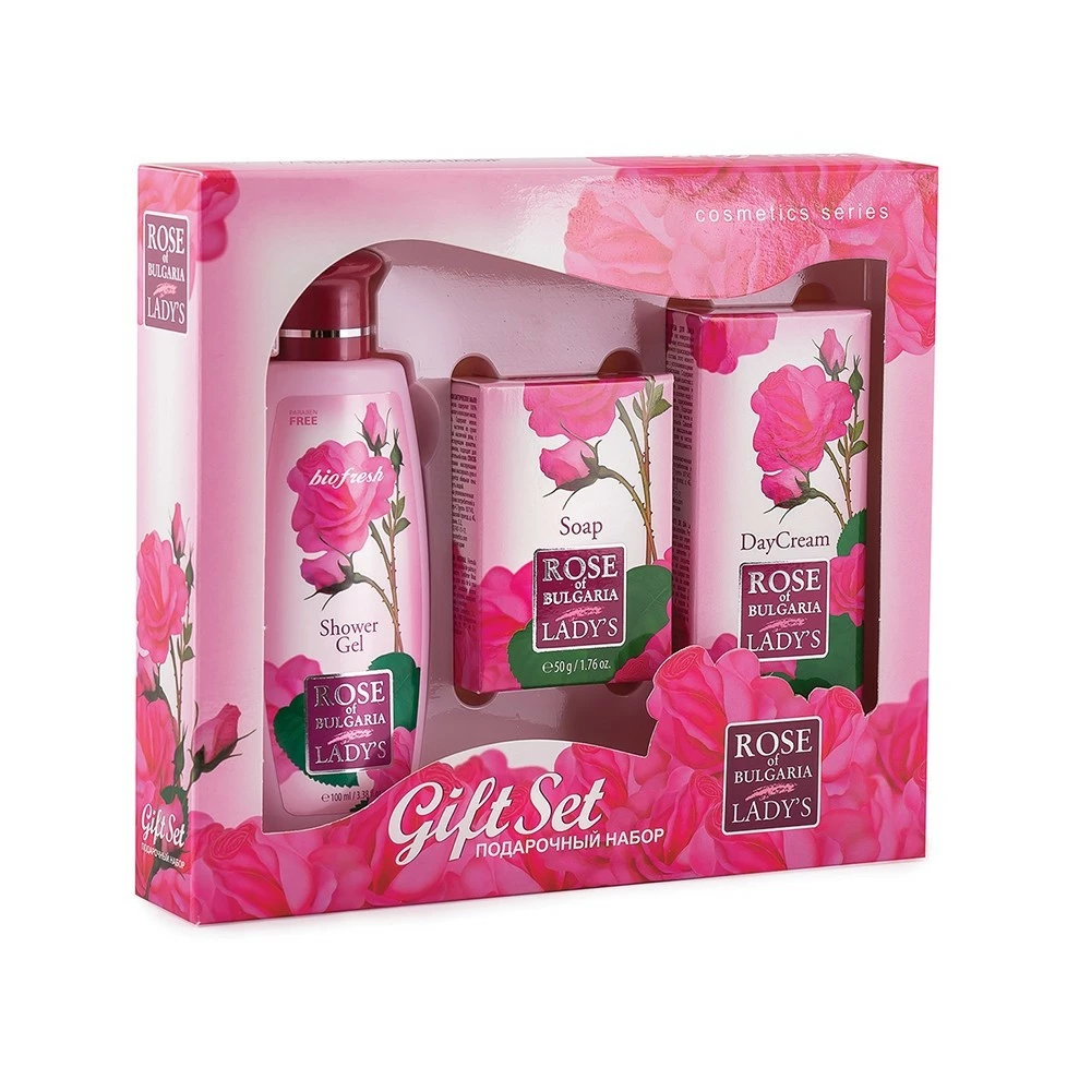 В комплект входят из: гель для душа Rose of Bulgaria 100 ml., косметическое мыло Rose of Bulgaria 50 gr. и дневной крем для лице Rose of Bulgaria 30 ml. Небольшая фасовка очень удобна для путешествий.